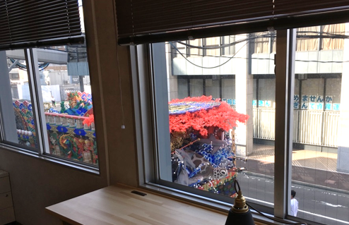 ユネスコ無形文化遺産に登録されている八戸三社大祭のときには、オフィスの特等席から見物でき、