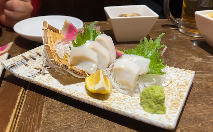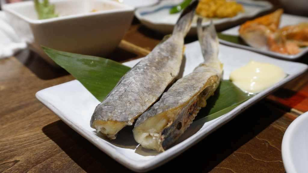 たち(タラの白子)、とうもろこしのかき揚げ、タコの頭の刺身、ニシンの刺身、こまいの炙り、地酒…と関東では見かけないメニューのオンパレード。