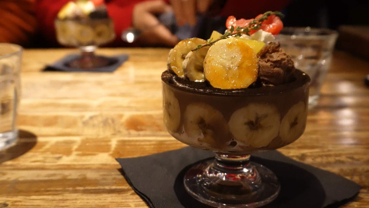 <芳醇でスモーキーな追いチョコソースをトッピングした『ショコラバナン』の素敵なグラデーションが先刻までのお酒と一日の疲れをフェードアウトしてくれるモダンな空気感に悶絶>