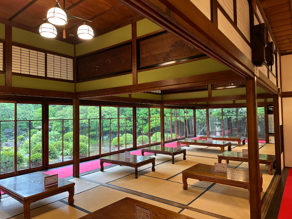 大正末期から昭和初期に増改築された、当時には珍しい二世帯住宅の居宅は、大正ロマンに懐かしさを感じつつ、洗練された美が、新しさも感じる美しさ。日本の古き良きを体全体で感じることができます。前面にひろがる庭園は、2023年に庭園ランキングで3位を受賞したというから納得。