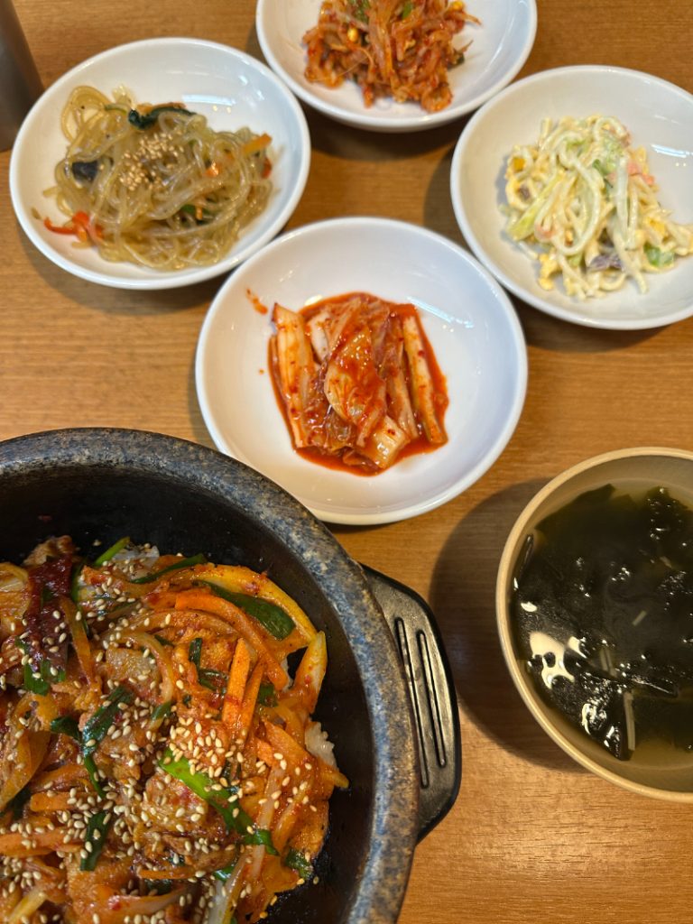 まだお昼にもなっていないというのに、お客さんがたくさん入ってるお店を発見!え、美味しそうだよ!突然お腹がすき始め、入ってみることに。チゲ、石焼ビビンバ、参鶏湯、そしてインスタント麺を使ったキムチラーメンなど、お手頃な価格でランチメニューが盛りだくさん。私たちはプルコギ石焼ビビンバをチョイスしてみました。待ってる間もテンションUP↑