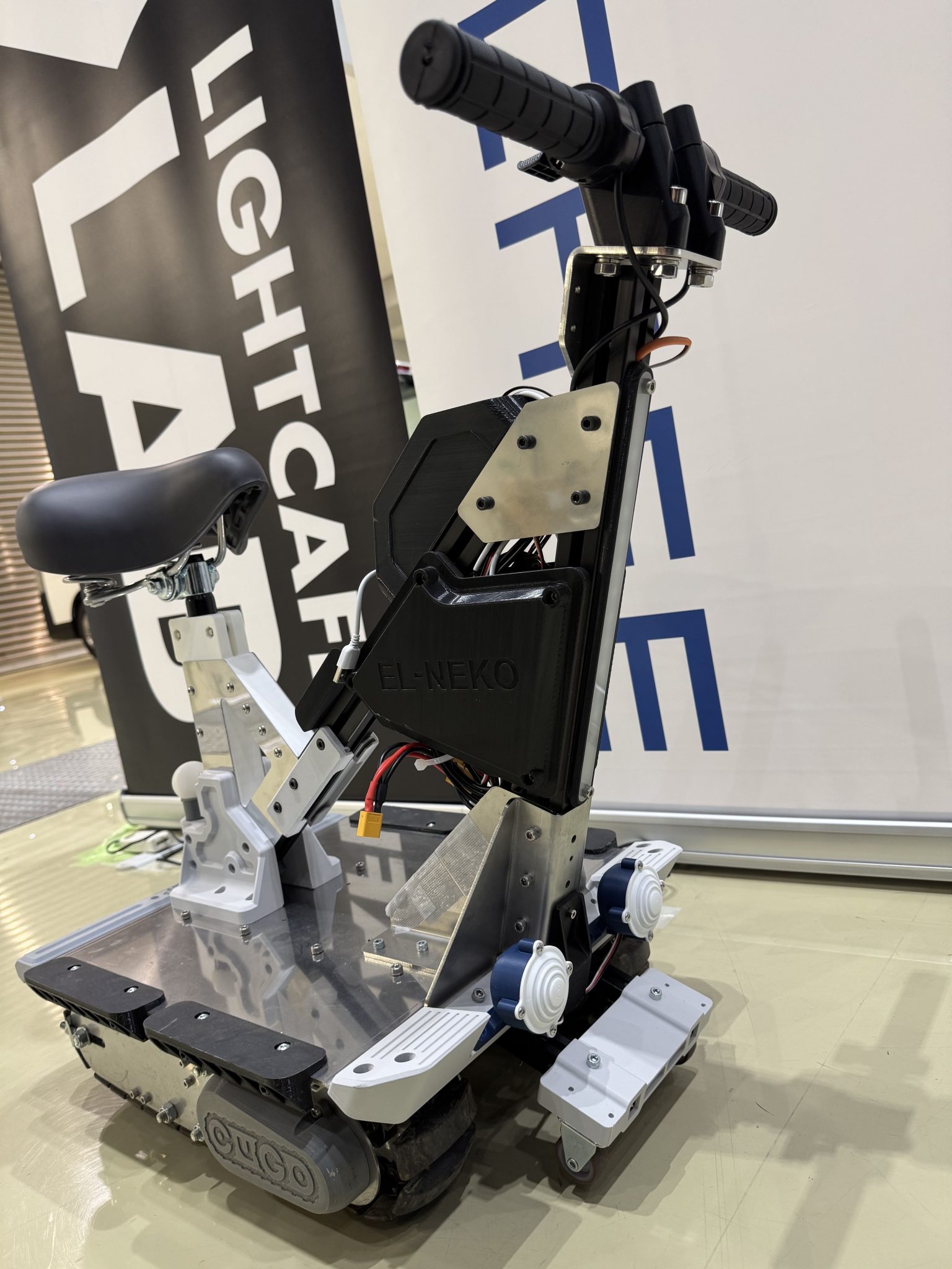 ロボット開発で使用したクローラユニットを利用し、小型のバイクを製作いたしました。