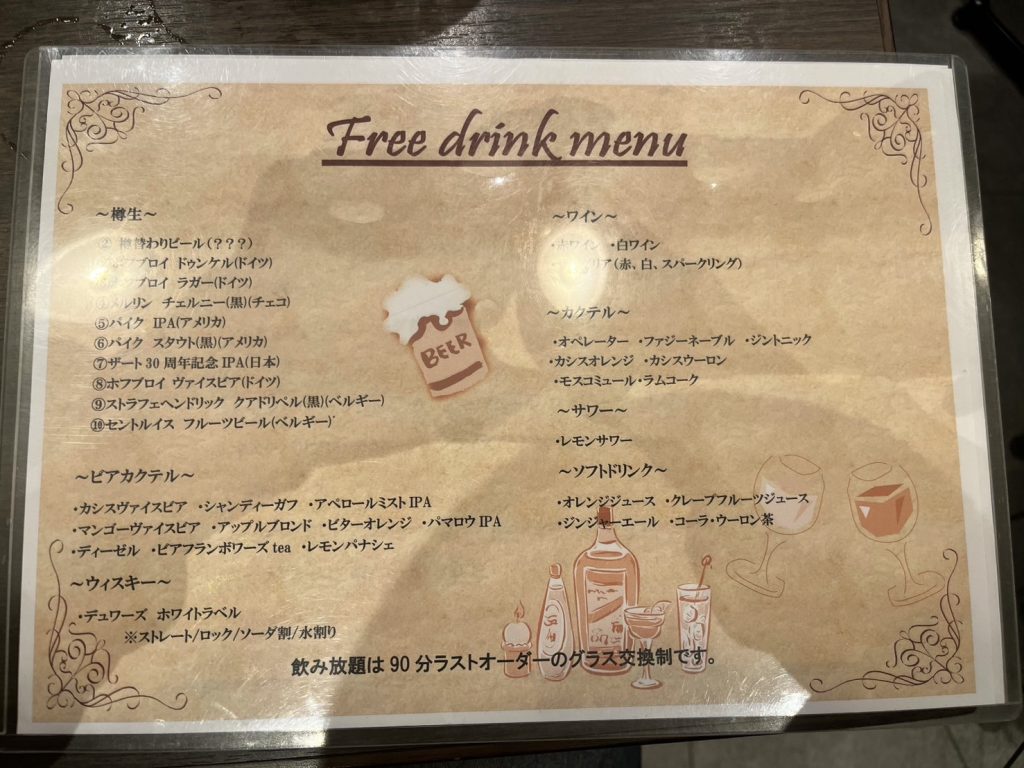 飲み放題ビールは10種類(多い!嬉しい!)で、ビアカクテルやワインもありました。