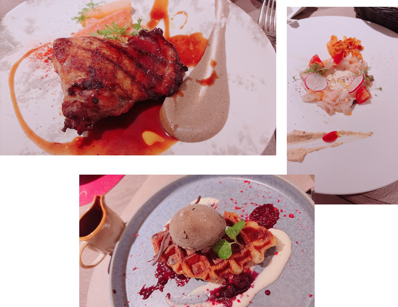 前菜、メイン、デザート各1皿や、ガッツリ食べたい方はメインディッシュを2皿にデザート1皿の組み合わせなどが選べたのですが、 せっかくなら1皿ずつ食べたいと全員「前菜、メイン、デザート」をいただきました!
