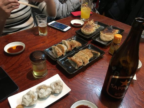 とりあえず餃子・焼売、飲み物は瓶ビールとホッピー。でっかくておいしい!!!