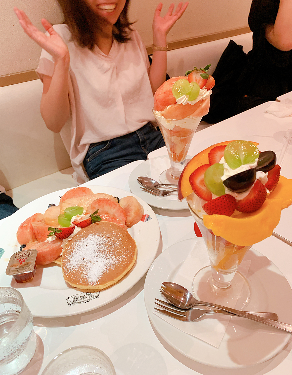 悩みに悩んだ末に、パンケーキ派とパフェ派にキレイに分かれ、注文を完了させましたっ。